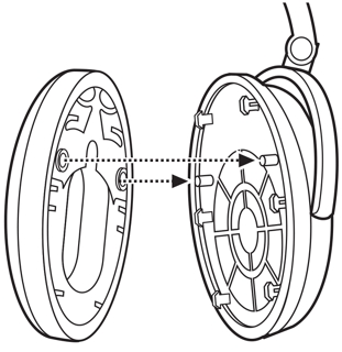 - Alignez les orifices situés à l’arrière du coussinet avec les deux points d’ancrage au niveau de l’écouteur