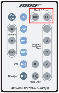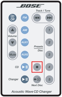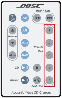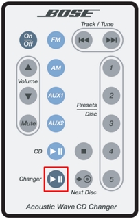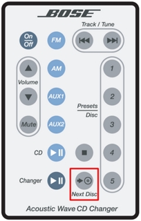The Acoustic Wave® multi-disc changer holds up to five CDs. When a CD is inserted into a slot in the changer and it is on, the changer’s display window indicates the number of the CD slot selected, the track number playing and the elapsed time.